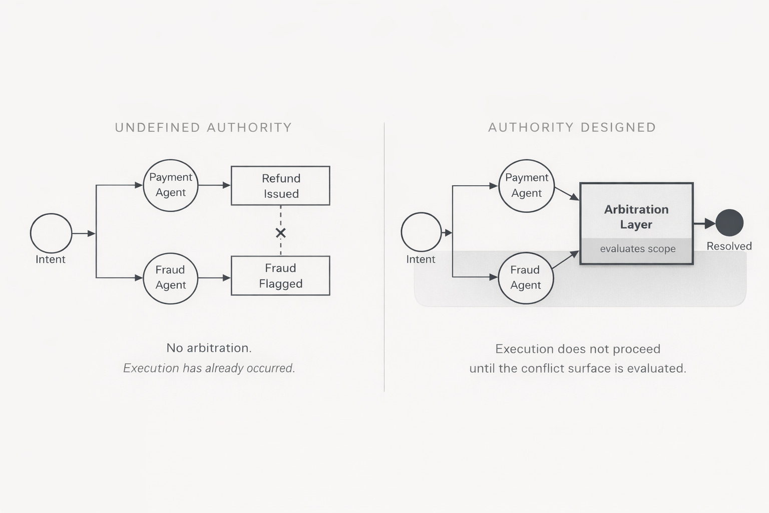 Figure 2: Authority design inserts an arbitration layer between conflicting agents. Execution does not proceed until the conflict surface has been evaluated.