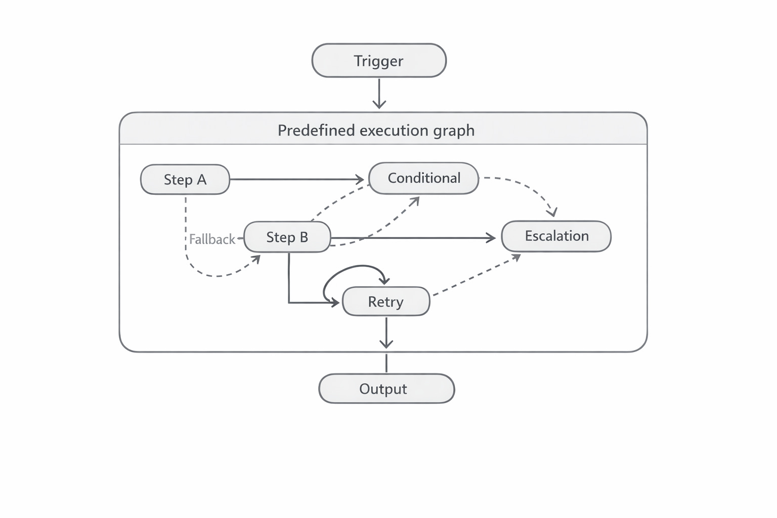 Deterministic automation has a structural elegance: explicit control flow, known state transitions, human-defined sequencing. When something fails, the system retries or escalates. The path graph is static. Workers do not decide. They execute.