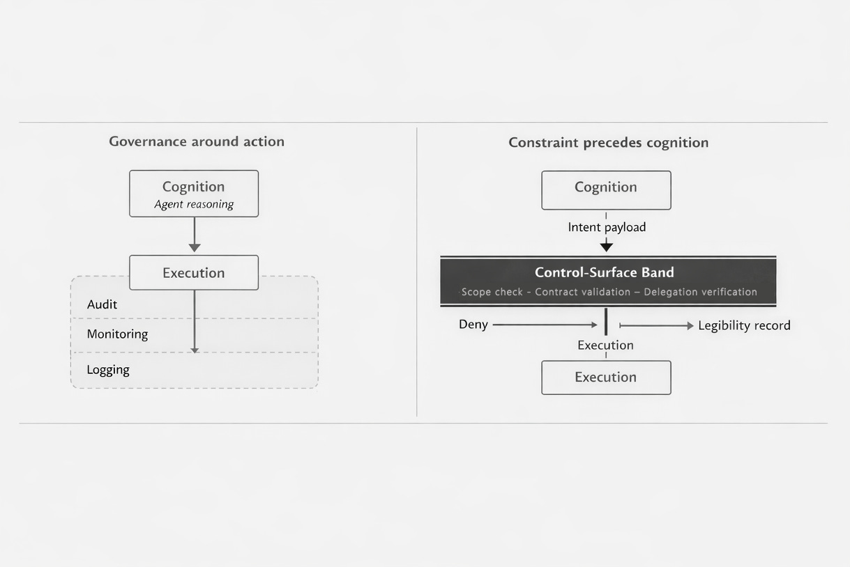 The architectural concept that makes “constraint precedes cognition” concrete is the control-surface band: the governance evaluation layer that sits between the agent’s reasoning and the system’s execution.