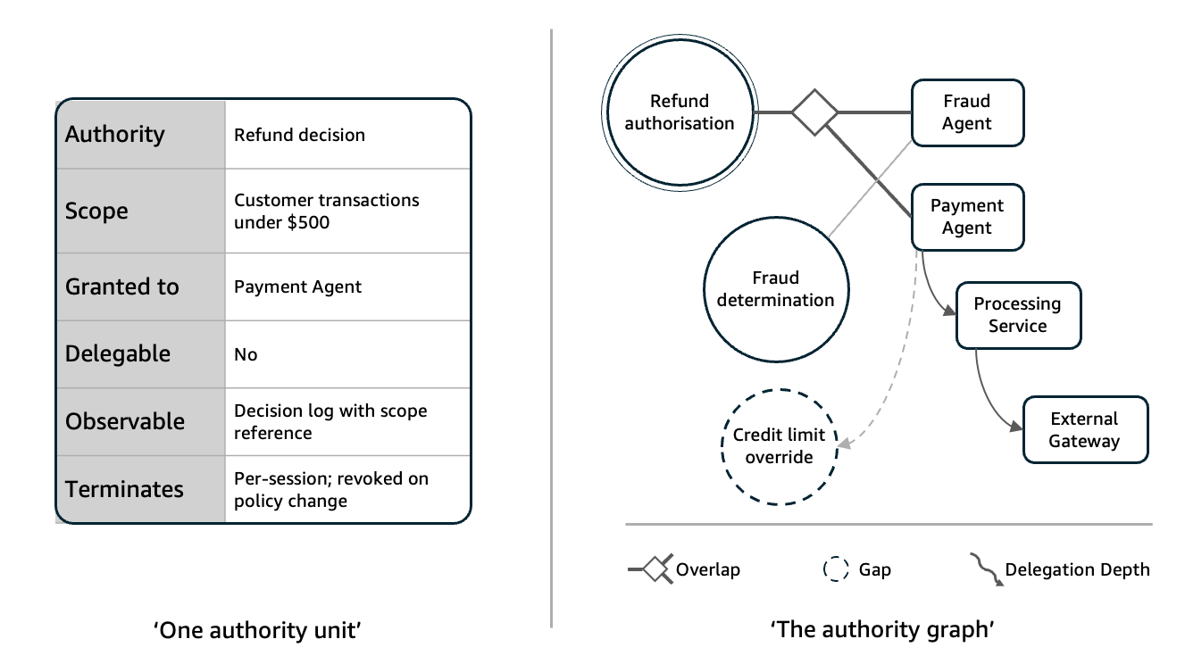 Authority is not a role: Roles describe what a component is. Authority defines what a component is allowed to decide. A fraud agent and a payment agent may occupy different roles, but if both can independently authorise a transaction, they hold overlapping authority, and the system has no mechanism to resolve the conflict. The failure in that scenario is not cognitive. It is constitutional.